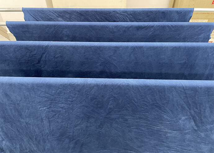 コート1着分を丁寧に撫でた後は、水で濯いでから脱水し、乾かしてから再び染料の中に入れる、という作業を繰り返します。この時、水洗いを丁寧におこない、色を完全に落とし切ることが染色の質を高める秘訣です。