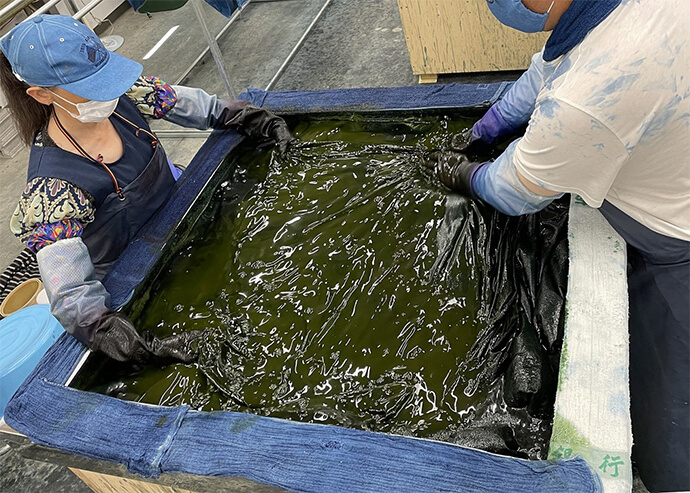 2人1組でコート1着分を染めます。藍染は通常の染色とは異なり、漬けておくだけでは染まらないため、手で撫でるようにして酸素に触れさせることで綺麗に染まります。1人は布を広げて、もう一人が少し擦り込むように、全ての面を均等に撫でることで均一なクオリティーを保ちます。