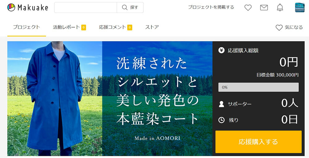 『Makuake』の本プロジェクトのページでは、「サンヨーソーイング 青森ファクトリー」コート専業50年の技術と、「あおもり藍」による染色の特徴を伝え、1つの製品に注ぐ技術とイノベーションを最大限に訴求していきます。