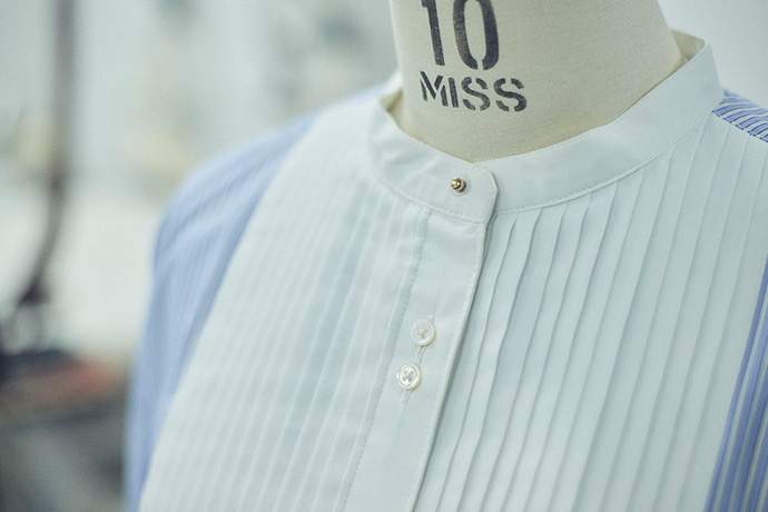 今回「S.ESSENTIALS」が"名品シャツ"として販売を開始した「ピンタックシャツ」「ピンタックシャツワンピース」は、「S.ESSENTIALS」が女性向けの理想のシャツを作り上げるために、当社が誇るパタンナー(※1)集団「SANYO ENJIN」と企画開発を行い、国内のメンズドレスシャツ最高峰の工場ともいわれる「HITOYOSHI」にて縫製したスペシャルな1着です。