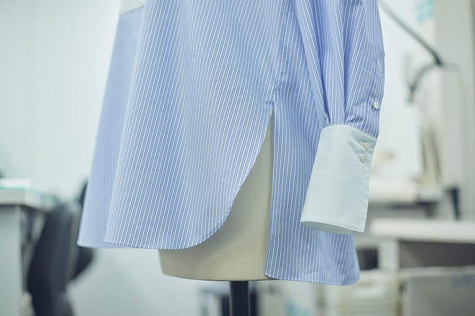 デザイン画を基にパタンナーがパターン(型紙:服の設計図)を起こすという通常の商品開発の流れとは異なり、今回は「SANYO ENJIN」のパタンナーがデザインの段階で商品開発に関わり、『永く愛用したいシャツ』『日常のハレの日に選びたいシャツ』をキーワードに試作を重ねました。体型をカバーするシルエットや、シンプルで普遍的でありながら手が込んだデザインで、それぞれのもつ技術を駆使し仕上げています。