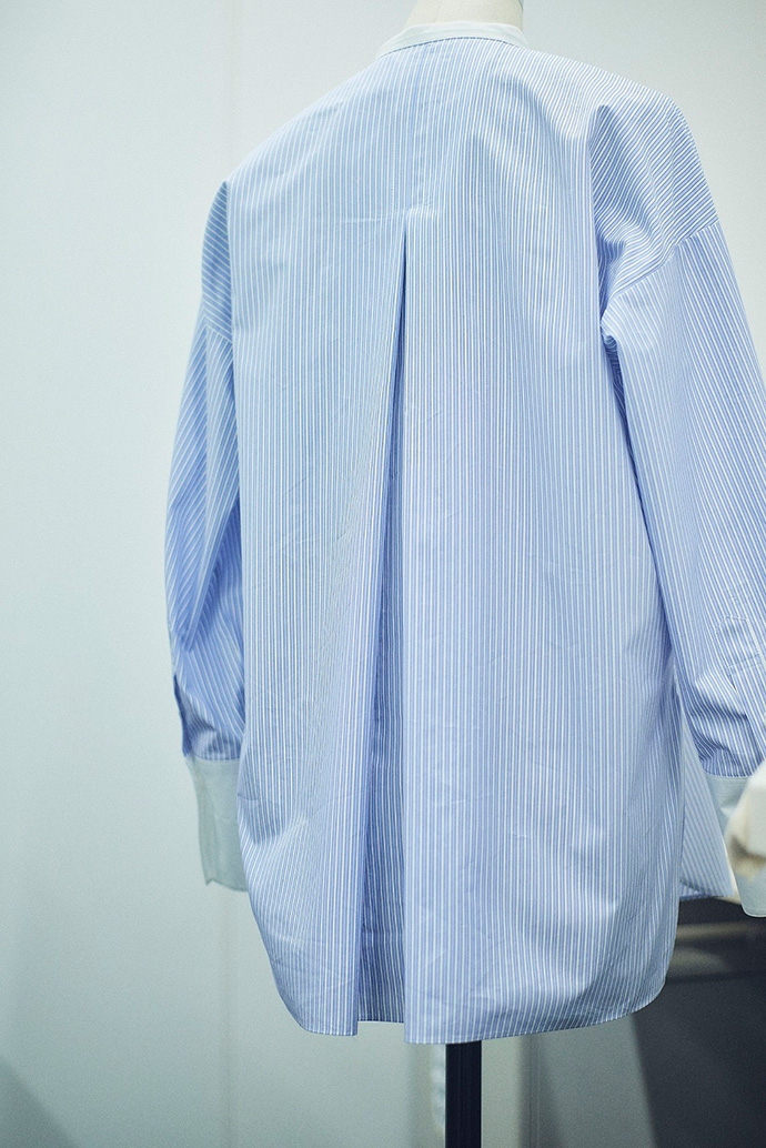 襟はスタンドカラーの起源とも言われる普遍的なバンドカラーを採用。メンズドレスシャツに用いられる胸元のプリーツタックや第一ボタンをメタルのギボシ釦とすることでエレガントさも加えています。