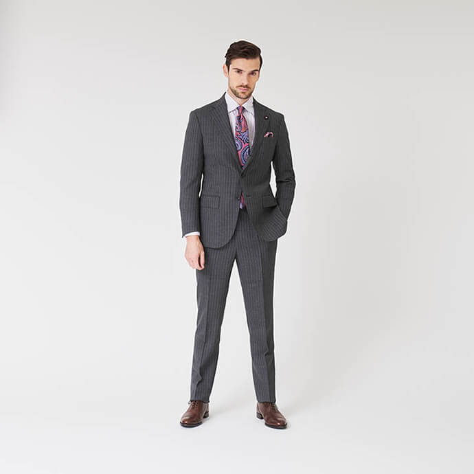 「ドーメル」社製で、環境保護とトレーサビリティが保証された「TONIK WOOL」を使用した、チャコールグレー地にベージュのストライプを織り込んだスーツです。正しい管理体制のもと生産されるパタゴニアウールの超強撚糸を織り上げることで、膨らみと光沢を持たせました。
