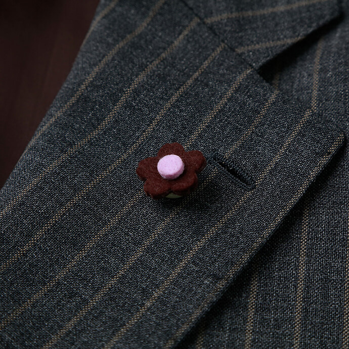 ラペルのフラワーホールには桜のモチーフのブートニエールが付属する