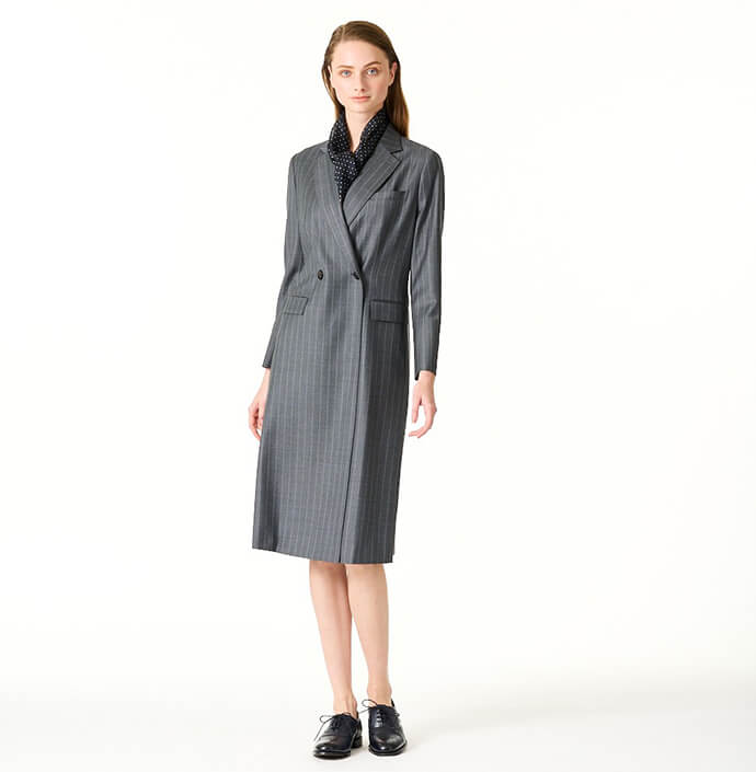 ドーメル」社製の代表的な生地で、美しい光沢感が特徴の「AMADEUS 365」を使用したエレガントなコートドレスです。ウールを使用していますが非常に軽量で、その名のとおり365日を通して着用できます。イタリア生地のようなしっとり感を持ちながらも英国生地ならではの丈夫さを兼ね備えたバランスの良さが特徴です。