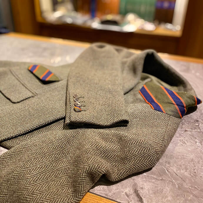 擦り切れたネクタイをほどき、ジャケットの襟裏などにネクタイの生地をアレンジした