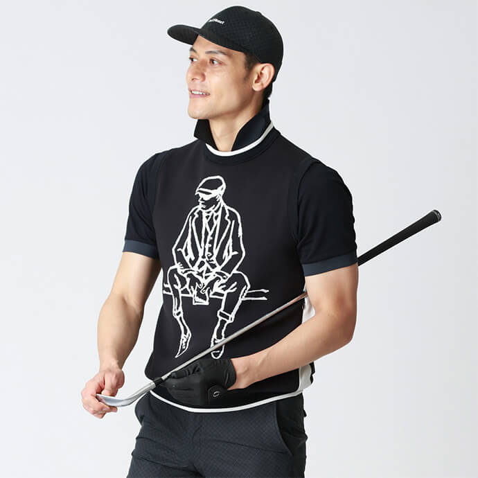 「ポール・スチュアート」のアイコンである" MAN ON THE FENCE"(マン・オン・ザ・フェンス)の図柄を編地で表現したベストや、寄木細工の柄を布地で再現した"PARQUET PATTERN"(通称:パケ柄)のポロシャツなど、ブランドを象徴するアイコンやシンボリックな柄をゴルフウェアで表現します。通常ラインとは異なり、モノトーンカラーを基調としたアイテムで構成することでモダンなテイストを加味しました。