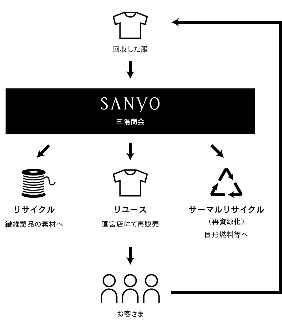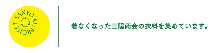 そして、このマテリアリティへの取り組みの一環として、このたび当社の3R活動の総称を「SANYO RE: PROJECT(サンヨー・リ・プロジェクト)」として、3月28日(木)よりリユースを前提とした衣料回収活動を、直営店並びに一部百貨店内のブランド各店舗にてスタートすることとしました。